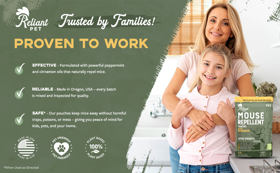 Reliant Pet repellent pouches are proudly crafted in the USA, protecting up to 65 sq ft for 1-3 months. Whether for your home, garage, car, or outdoor spaces, our pouches offer reliable, long-lasting rodent protection.