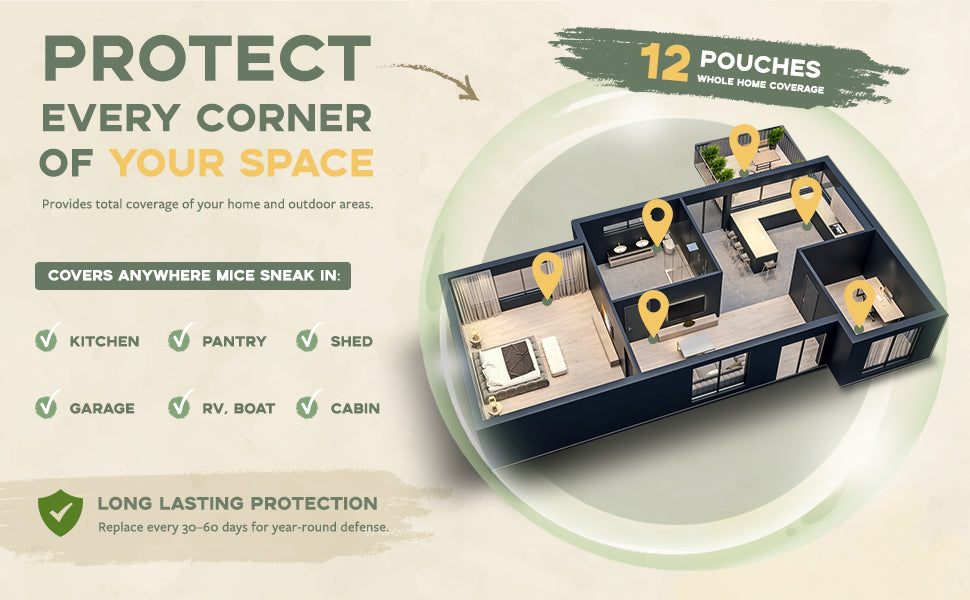 Simply place the pouches in key areas, away from strong airflow, and let them do the rest. No need to clean up dead rodents or deal with complicated traps—just effective, natural protection.